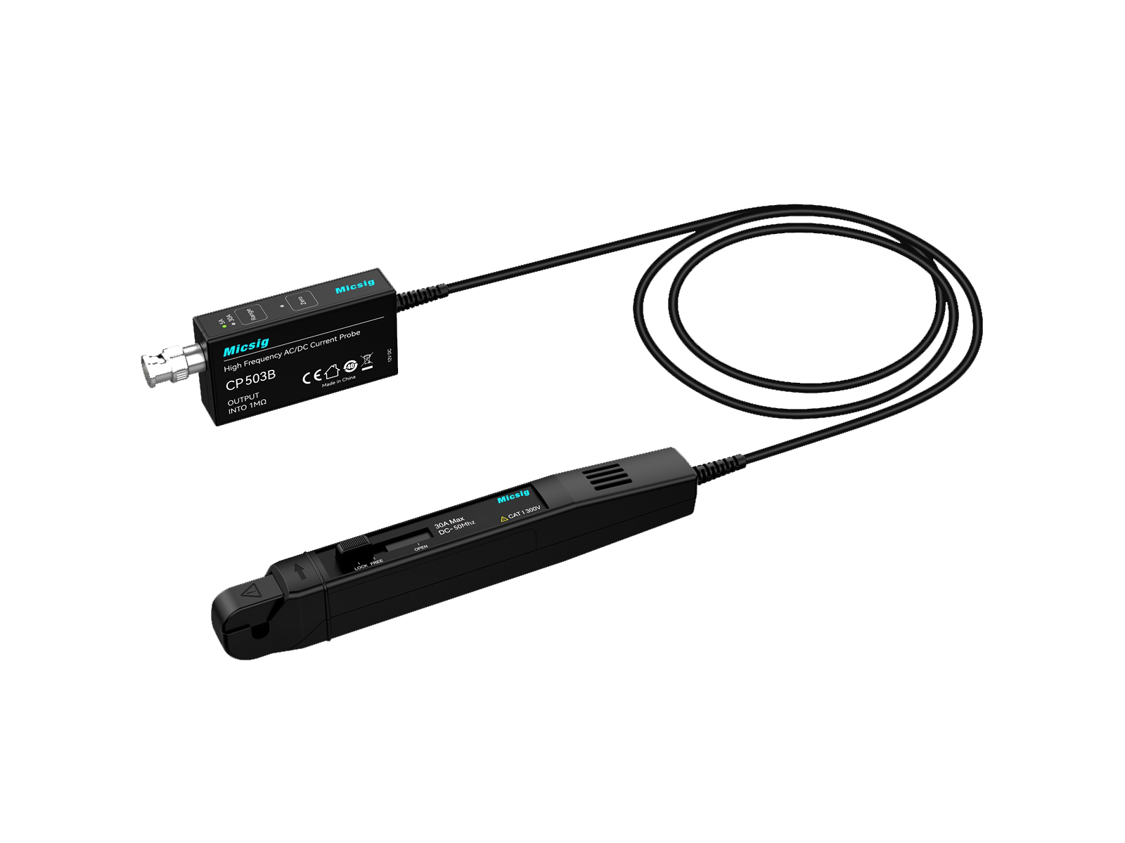 The Micsig CP503B current clamp with 50 MHz bandwidth has an excellent price-performance ratio. It is therefore a good option, if you are looking for an inexpensive current probe. Thanks to the standard BNC interface, the CP503B is suitable for all oscilloscopes. In addition, the CP503B offers accurate and simple AC/DC measurement functions, a range selection of 5 A / 30 A, an overload indicator and an undercurrent measurement as well as a DC accuracy of 1 %.